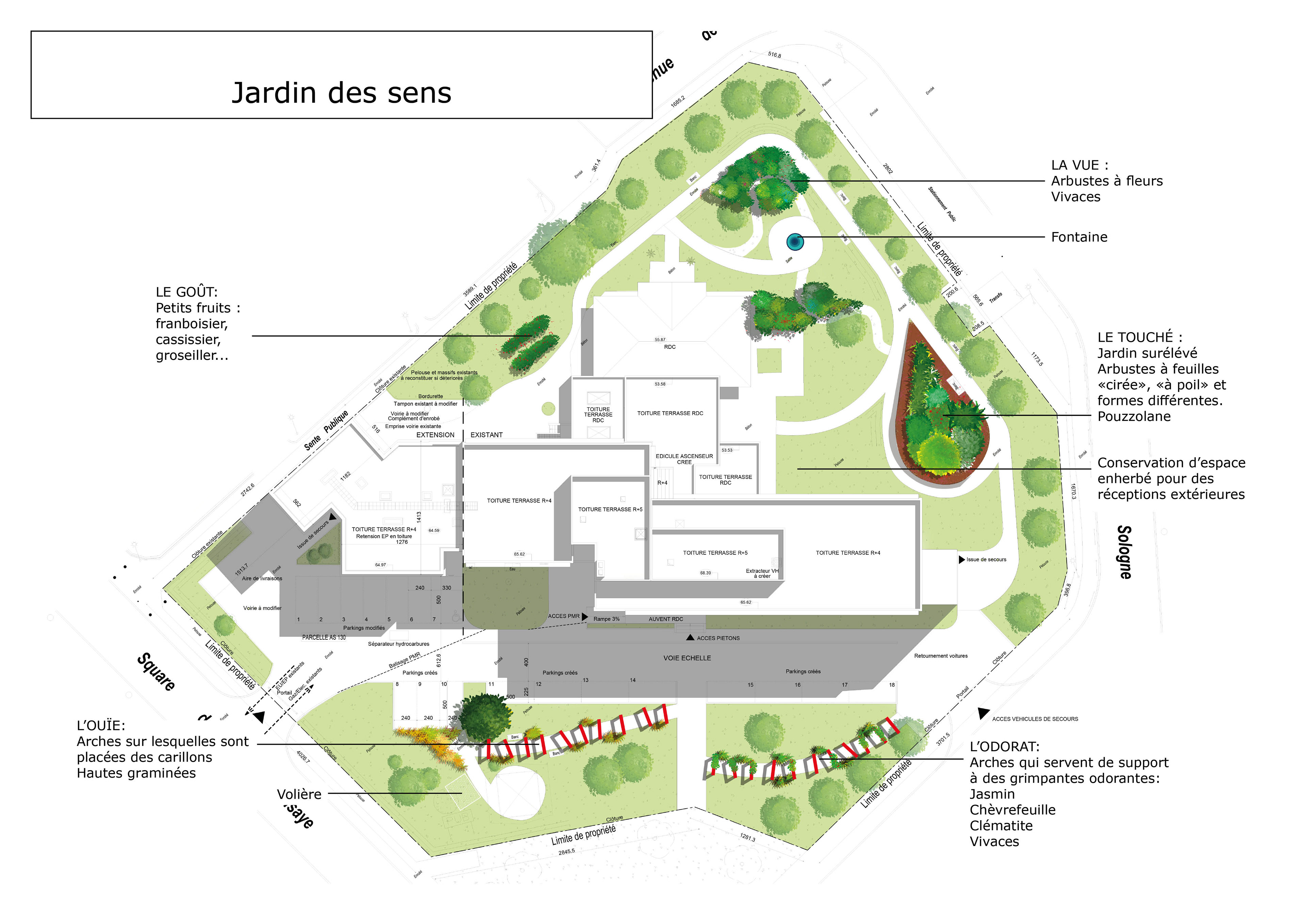 Ce jardin a une mission thérapeutique, chaque sens est stimulé de façon différente et offre un but à la promenade comme le bassin ou la volière. Il contribue au bien-être des pensionnaires en offrant un cadre apaisant et serein.